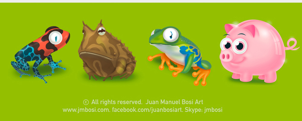 Character design, 2D animations for map scene, GUI, animals cartoons, frogs, piggie, birds, piranhas